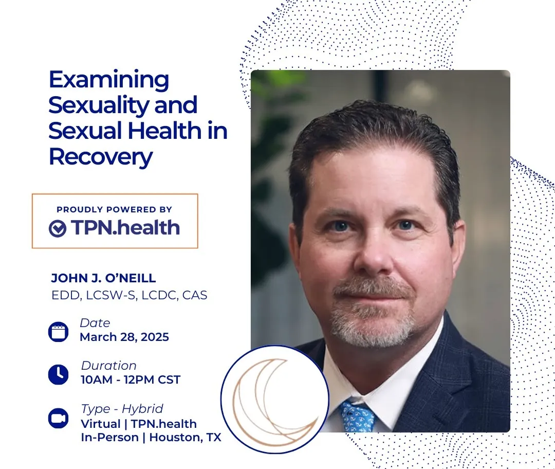 Join us for an insightful workshop exploring sexuality and sexual health in recovery, led by John J. O'Neill, EDD, LCSW-S, LCDC, CAS. This hybrid event offers both in-person and virtual attendance options, making it accessible to all participants. The in-person session will be held in Houston, TX, with space for 40 attendees, while virtual attendance through TPN.health is unlimited. Don't miss this opportunity to gain valuable insights into this important aspect of recovery.